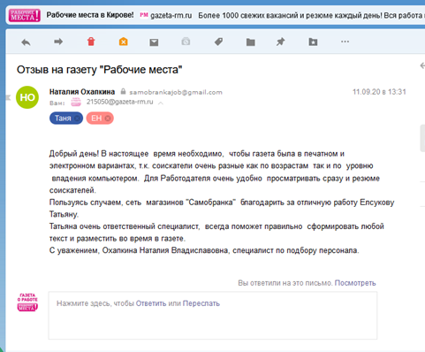 Я очень довольна сотрудничеством с газетой «Рабочие места». За две недели к нам пришло больше 50 резюме, соответственно нам удалось провести полноценный конкурс и принять на работу действительно лучших. Также радует оперативность и отзывчивость сотрудников газеты. Разумные цены, высокая эффективность, качественный сервис – именно эти характеристики я отметила, оценивая газету «Рабочие места».
