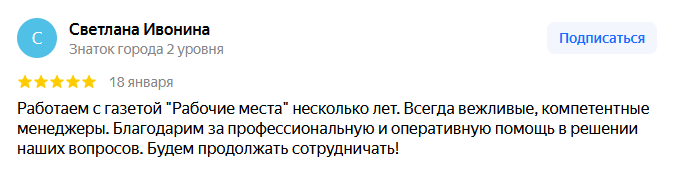 Мы и в будущем рассчитываем на сотрудничество с газетой «Рабочие места» при поиске соответствующего персонала! Ваши профессиональные менеджеры всегда проявят внимание, подскажут максимально выгодные условия.