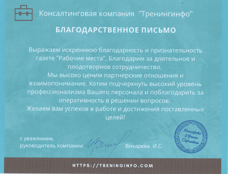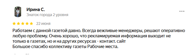 Мне очень нравится сотрудничать с газетой "Рабочие места". Менеджеры всегда вежливы, с ними приятно разговаривать.Объявления выходят вовремя.