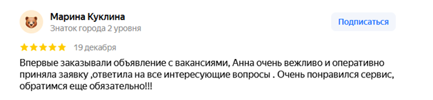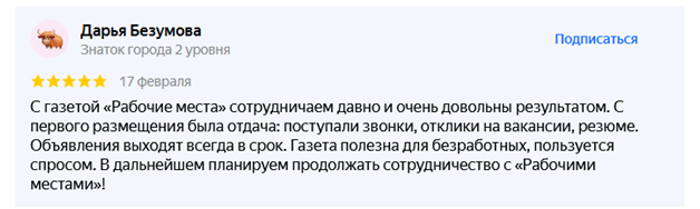 Если речь идёт о рабочих вакансиях, то отклики поступают оперативно и активно в течение недели. Если речь идёт о вакансиях специалистов и руководителей - откликов значительно меньше, что снижает и скорость закрытия вакансий. Тут издание в большей степени выступает в качестве дополнительного, а не основного инструмента. Работу менеджеров и издания в целом оцениваем на отлично. Работают всегда оперативно, вежливо, учитывают пожелания, "идут на встречу". В дальнейшем мы продолжим наше сотрудничество, и будем советовать издание другим.