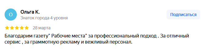 Благодарим газету Рабочие места и особенно нашего персонального ведущего менеджера за плодотворную работу в рамках организации и реализации размещения наших вакансий. Хочется отметить точное выполнение взятых на себя обязательств, творческий подход к решению каждой задачи. Нам очень нравится работать с вами, нравится удобный сервис вашего агентства и внимание к деталям. Надеемся на взаимовыгодное сотрудничество в будущем.