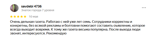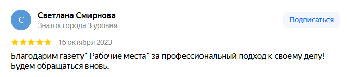 С газетой "Рабочие места" лично я работаю уже давно. Это хорошая возможность сообщить потенциальным кандидатам об открытой вакансии в компании, а кандидатам быть уверенными, что все вакансии в газете от "честных работодателей" и проверены. Не важно, какую организацию я представляю как персональщик, я всегда получаю высокий сервис. Менеджер по работе с клиентами приветлив и поможет выбрать лучший вариант, чтобы объявление о вакансии "сработало". Обмен документами также происходит оперативно. Отдельное спасибо нашему менеджеру Елсуковой Татьяне за ее профессионализм и позитив.